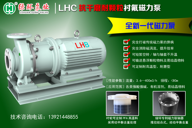 一、概述 LHC系列衬氟磁力泵是绿环公司技术团队历时数年精心打造的一款“抗干磨衬氟磁力泵”,该系列泵应...